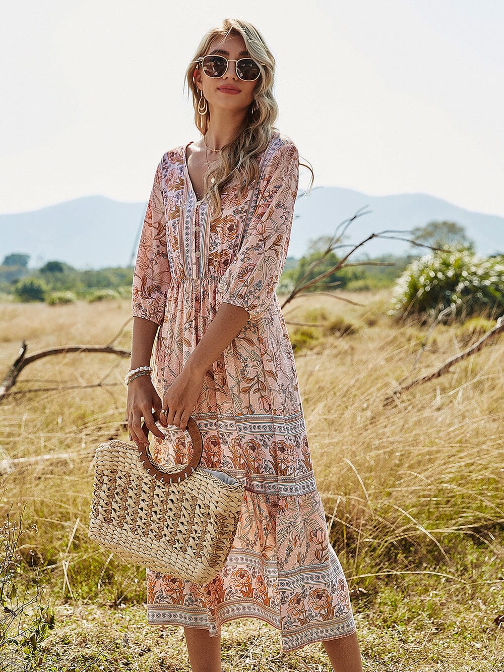 This floral print midi dress are sure to make you feel amazing. lightweight and soft. Features 3/4 elastic cuffs, cut with a v-neck style to showcase your collarbone, a lovely floral print throughout surplus bodice. A high waist top with a flowy A line waist maxi skirt to completed your casual but elegant look.
